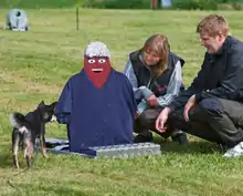 While the dog is walking with its owner, a half-silhouette of a person is quickly raised 3 metres from the dog.[16] The dog should totally overcome its fear and return to a calm state, indicated by 'contact' with the cut-out (judged by the observer). If the dog is still uncertain, the step progresses to other phases, such as the handler and test leader squatting down next to the cut-out and encouraging the dog. Once the dog has made 'contact', the handler is instructed to pat and praise the dog.[14] Fear, aggression, and how quickly the dog overcomes the negative emotional experience are observed and noted.[3]