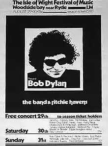 In mid August 1969, Bob Dylan had confounded the media's expectations by shunning the Woodstock Festival, an event he had helped to inspire.[2][3] Instead, after three years in virtual seclusion with his family, Dylan decided to make his comeback a fortnight after Woodstock, by headlining the Isle of Wight Festival at Wootton, just off the south coast of England.[4][5] Now a popular act in their own right, the Band agreed to back Dylan for the performance,[6] just as they had (as the Hawks) on his controversial 1966 world tour.[7] In a repeat of his UK concerts from 1966, leading figures in the English music scene began to gather on the island to show their support for Dylan,[8][9] the singer widely considered "the minstrel to a generation".[10]