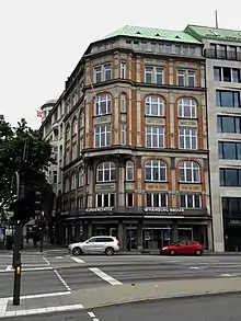 The Group of Companies Headquarter are based in the Kontorhaus am Ballindamm building (house number 1), on the corner of Glockengießerwall, in Hamburg.[78] It is a five-storey corner building that overlooks the Außenalster and Binnenalster lakes and is located in close proximity to the Lombard Bridge, the Kunsthalle Hamburg and Hamburg Hauptbahnhof central station. The building was planned at the end of the 19th century and completed in 1907. In the Second World War, a bomb destroyed its roof and setback level, both of which were rebuilt in 1959. The building's facade was extensively renovated in two stages between 2002 and 2003. During the renovation work, columns, wrought-iron structures, fluting, cornices, Cotta Sandstone stone work and mosaics were uncovered and restored. In 2005, the restoration work was praised by the Patriotische Gesellschaft von 1765 (Patriotic Society of 1765).[79]