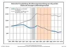 Development of population since 1875 within the current boundaries (Blue line: Population; Dotted line: Comparison to population development of Brandenburg state; Grey background: Time of Nazi rule; Red background: Time of communist rule)
