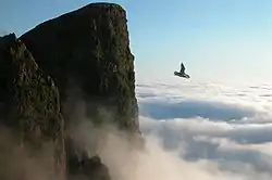 Beinisvørð (Beinisvord) is a 469 metres (1,539 ft) high sea cliff in Suðuroy, Faroe Islands, the highest sea cliff in Suðuroy.[1] It is located between the villages of Lopra and Sumba. Beinisvørð has vertical cliffs facing the sea and a green slope down towards the village of Sumba. The triangular top of Beinisvørð is visible from many places in Suðuroy, including Lopra, Nes and Marknoyri, the easternmost part of Vágur. In clear weather it is also visible from Smyril M/F just before she enters the fjord of Trongisvágur, Trongisvágsfjørður. Men from Sumba used to rappel down the steep mountain side of Beinisvørð on bird lines (it is called "síging"; one man hangs on a thick rope, while several men hold it at the top) in order to catch sea birds and to collect eggs. Both birds and their eggs were important food for the people of Sumba in the past. Several men have been killed while doing this; sometimes a stone fell on a man's head, fatally injuring him. In 1975 a big avalanche at Beinisvørð destroyed numerous bird habitats and landmarks.[2]