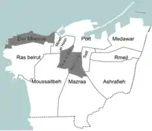 The constituency was established as part of the 1960 Election Law.[2][3] In the 1957 parliamentary election Beirut had been divided into two constituencies, and Dar El Mreisse, Zuqaq al-Blat and Bachoura had been part of the same constituency as Minet el Hosn, Port, Ras Beirut and Medawar.[4] The issue of the delimitations of the Beirut constituencies had been contested, but an agreement between Christian and Muslim leaders was reached on February 23, 1960, by which there was agreement that Beirut II would be assigned two Muslim seats and one Maronite seat. The Election Law was passed in April 1960, with three seats for Beirut II (1 Sunni, 1 Shia, 1 Minorities).[3]