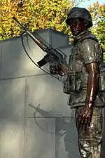 The design included a representation of two broken walls—reminiscent of the "crumbled walls" of the building demolished by the truck bomb attack—with a pedestal between them to support a statue.[1] The bronze statue included in the memorial was later created by Abbé Godwin, the same artist who had created North Carolina's Vietnam Memorial in Raleigh, North Carolina, and was dedicated on October 22, 1988.[1] A full-size replica was created for the National Fleet Reserve Associated Headquarters, in Alexandria, Virginia, and miniature replicas were created for the Marine Corps Scholarship Foundation, to help fund scholarships for military dependents.[1]