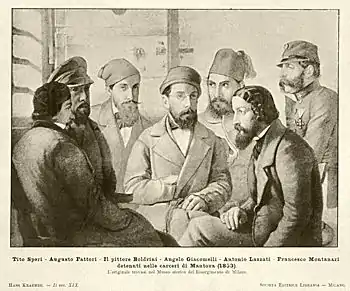 "Speri, Fattori, the painter Boldrini, Giacomelli, Lazzati and Montanari imprisoned in Mantua in 1853", retouched reduction, lithograph[1]