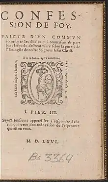 The Confession of Faith, popularly known as the Belgic Confession, is a doctrinal standard document to which many Reformed churches subscribe. The Confession forms part of the Three Forms of Unity of the Reformed Church,[1] which are also the official subordinate standards of the Dutch Reformed Church.[2][3] The confession's chief author was Guido de Brès, a preacher of the Reformed churches of the Netherlands, who died a martyr to the faith in 1567, during the Dutch Reformation.[4] De Brès first wrote the Belgic Confession in 1559.[5]