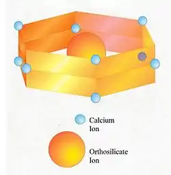 Based on this, the formula can be expressed as Ca1.94Mg0.02Na0.01K0.03Fe0.02Al0.07Si0.90P0.01O3.93. In practice, the composition varies with the bulk composition of the clinker, subject to certain limits. Substitution of calcium ions or orthosilicate ions requires that electric charges be kept in balance. For instance, a limited number of orthosilicate (SiO4−