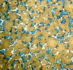 The minerals in Portland cement clinker may be observed and quantified by petrographic microscopy. Clinker nodules are cut and ground to a flat, polished surface. The exposed minerals are made visible and identifiable by etching the surface. The surface can then be observed in reflected light by optical microscopy. In the example, a clinker nodule has been polished and etched with hydrogen fluoride vapour. The alite shows as brown, the belite as blue, and the melt phases as white. Electron microscopy can also be used, in which case the minerals may be identified by microprobe analysis. The preferred method to quantify the minerals accurately is X-ray diffraction on the powdered clinker, using the Rietveld analysis technique. Belite is much harder to grind in a cement mill than alite.