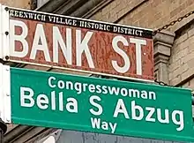 Various landmarks in New York City bear Abzug's name. On March 1, 2019, the recently built Hudson Yards Park was renamed Bella Abzug Park as a tribute to women's history month and its location in her former Congressional district.[48] In New York City's Greenwich Village, a portion of Bank Street is named for Abzug.[49]