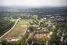 Over 40 buildings stand on the hills of Bellarmine's 135-acre (0.55 km2) campus in Louisville's Belknap neighborhood, at the western edge of the larger Highlands area.
