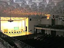 The building was obtained by the University of Pittsburgh in a lease-purchase agreement in 1984 and reverted to full university ownership ten years later.[10] Today, Bellefield Hall is a 110,000-square-foot (10,000 m2) facility that is home to a variety of university offices and services. For the university's Department of Music, it houses rehearsal spaces, classrooms, graduate student offices, and the William R. Robinson Digital Recording Studio. A recently renovated 676-seat auditorium holds many of the Department of Music's recitals and concerts.[11][12][13] Bellefield Hall also houses a sports gym, fitness center, and indoor swimming pool.[12] The second floor fitness center was renovated and expanded in 2005.[14][15] A classroom specifically designed for African-drumming music was constructed in 2008.[16] Bellefield Hall is also home to the Collegiate YMCA at the University of Pittsburgh.[17]