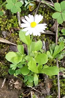 B. sylvestris - Perennial, like B. perennis but with longer flower stems (10-45 cm) and longer (3-18 cm) leaves with 3 veins that gradually narrow to their base, and slightly larger flower head (2-4 cm).[6][7]