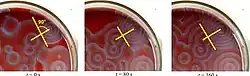 Strikingly similar oscillatory spiral patterns appear elsewhere in nature, at very different spatial and temporal scales, for example the growth pattern of Dictyostelium discoideum, a soil-dwelling amoeba colony.[10] In the BZ reaction, the size of the interacting elements is molecular and the time scale of the reaction is minutes. In the case of the soil amoeba, the size of the elements is typical of single-celled organisms and the times involved are on the order of days to years.