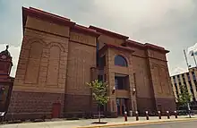 The Beltrami County Courthouse is a three-story, red, brick-and-sandstone building in the Beaux-Arts style. Its most striking feature is its rotunda, which occupies the center of the main hall on the first floor and extends past the second floor into the dome. A railing surmounted by a brass guardrail circles the rotunda on the second floor. On the exterior, a convex dome rises above an arcaded tower topped by a statue of blind Lady Justice with her scale.[2]