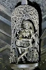 Above the perforated screens, on capitals of the supporting pillars, are madanakai (Salabhanjika) figures. There were originally 40 madanakai, of which 38 have survived in damaged or good form. Two of these are Durga, three huntresses (with bow), others are dancers in Natya Shastra abhinaya mudra (acting posture), musicians, women dressing or doing make up, a woman with a pet parrot, men making music.[41][42] A majority of these madanakai figures are also carved into miniatures in the sixth band of the outer wall around the pradakshina patha.[41]
