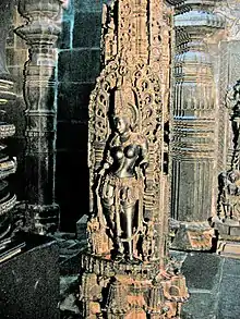 In the center of the hall is a large open square, above which is a domed ceiling about 10 feet in diameter and 6 feet deep.[53] At the top is a lotus bud with Brahma, Vishnu and Shiva carved on it. At the bottom of the dome is a series of friezes with the Ramayana story.[53] On the capitals of the four pillars are madanikas (Salabhanjika). One represents dancing Saraswati, the Hindu god of knowledge, arts and music. The others are regular dancers, but with different expressions. One is dressing her hair, the other in a Natya posture, and the fourth has a parrot seated on her hand. The head and neck jewelry made of rock are freely mounted and can be moved. The bracelets similarly are moveable.[53] The design of the ceiling follows the Hindu texts, and is a modified utksipta style with images placed in concentric rings.[15]
