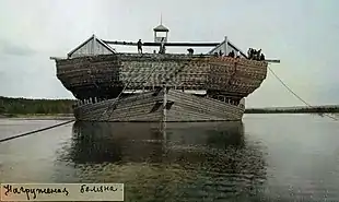 Belyanas were built since the 16th–17th centuries at the places of timber extraction in the Upper Volga region and on the Kama,[1] and were designed for a single trip downstream. The main cargo was timber, in some cases bark fibre, mats, and other similar goods. The length of the hull was up to 120 meters, the width 25 meters, the height 5 meters, the load capacity up to 12,800 tons. The hull was not tarred, which determined the name of such a ship, беляна, derived from the Russian word белый, "white", as opposed to tarred ships, which were black. The cargo could be placed in the hull and in the superstructure with gradual expansion to the sides (up to 2.5–3 meters). There was no upper deck. Dense stacking of the loaded timber was used to achieve an acceptable structural strength of the ship. Two or three holes for anchors and probes were made directly above the laid cargo, and cabins[lower-alpha 1] were also erected, where the crew lived during the floating. The vessel traveled 2000 to 3500 km during the trip.[2]