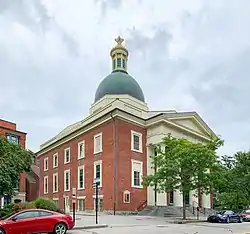 The church bears a striking similarity in style to the Massachusetts State House in Boston, designed by Charles Bulfinch. Prior to about 2007, the church's dome was covered with gold leaf which gave it a distinctive appearance. Due to weather damage to the gold leaf, the congregation voted in 1987 to replace the roof with more durable copper sheeting as part of a larger renovation project. This copper sheeting gives the dome its current green patina. The ceiling inside the Meeting House is curved at the edges, but doesn't indicate that the building is topped by a dome.[4][2]