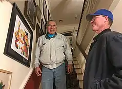 Benjamin Harjo Jr. (Absentee Shawnee/Seminole), artist, shows a painting to art collector Travis D. Day.