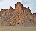 US Army Lt. James H. Simpson of the United States Corps of Topographical Engineers passed here on August 30, 1849, and recorded in his journal about these splendid peaks. Bennett Peak was later named after Major Frank Tracy Bennett (1840–1894), 9th Cavalry, who served as agent to the Navajos from 1869 to 1871 and 1880–81.[6] This geographical feature's name was officially adopted in 1915 by the U.S. Board on Geographic Names.[3] The Navajo name for this peak, Tsézhin ‘Ií’áhí, means "Trap rocks sticking up".[7] The first ascent of this peak was made in 1992 by Cameron Burns and Luke Laeser.[8] Scenes from the 2014 movie "Beyond the Reach" were filmed at Bennett Peak.[9]