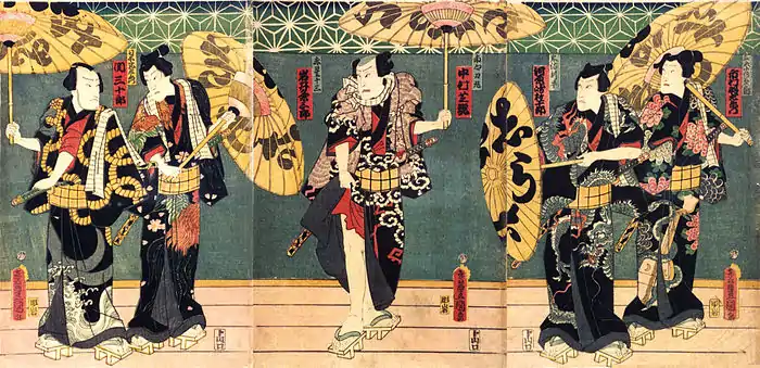 Woodblock printed playbill image from the March 1862 premiere at the Ichimura-za theatre in Edo, featuring actors Ichimura Uzaemon XIII (top/left), Nakamura Shikan IV (bottom/left), Seki Sanjūrō III (center), Iwai Kumesaburō III (top/right) and Kawarazaki Gonjūrō I (bottom/right).