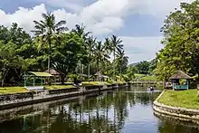 The pentagon-shaped Benteng Pendem covers a total of 10.5 hectares (26 acres), though 4 hectares (9.9 acres) have been used for the oil storage facilities. On site is an excavated moat, 500 metres (1,600 ft) long, 5 metres (16 ft) wide by 2–3 metres (6 ft 7 in – 9 ft 10 in) deep. Originally, the moat had been 10 metres (33 ft) deep and surrounded the fortifications.[2] The tourist entrance on the eastern side of the fortress, built by the Cilacap government after opening it to the public, is located in what was originally the rear of the Benteng Pendem. Around the fortress there are 11 places where cannons were originally sited.[2]