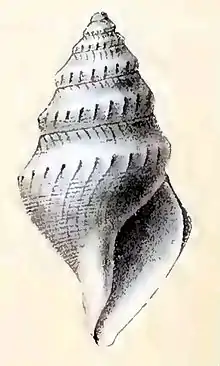 The spire is irregularly conical. The apex is eroded. The shell contains 8 whorls, making allowance for the eroded apex. They have a long, sloping, slightly concave shoulder, a blunt angulation about two-thirds down, and below this are nearly cylindrical. The fifth whorl enlarges somewhat disproportionately. And the last whorl is swollen, with a sharper angulation than the rest. The base is convexly conical, and is produced into a lop-sided, centrally situated, small-pointed snout. The suture is small but distinct, being slightly channelled by the minute horizontal shelf formed by the edge of the infrasutural collar. There is a very slight contraction of the whorls into it. The aperture is rather small, rhomboidally pear-shaped, being pointed above, prolonged into the rather short and broad siphonal canal below, and having a blunt angulation in the outer lip and at the base of the columella. The outer lip is very thin. It is somewhat rectilinearly curved. Its edge, on leaving the body, retreats immediately to form the shallow rounded open sinus which occupies the shoulder below the suture. Below this it advances with a long oblique forward slope in the line of the riblets, and then, from about the middle, retreats on a very regular curve to the point of the columella. The inner lip has a thin glaze with a defined edge. It is very narrow on the body, but spreads round the columella. It is convex on the body, with a bluntly angular concavity at the base of the columella, which is short, small, conical, unequal-sided, obliquely cut off in front, with a narrow rounded twisted edge.[2]