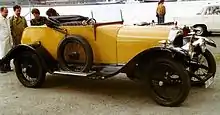 The Bentley 3 Litre was a car chassis manufactured by Bentley. The company's first, it was developed from 1919 and made available to customers' coachbuilders from 1921 to 1929. The Bentley was very much larger than the 1368 cc Bugattis that dominated racing at the time, but double the size of engine and strength compensated for the extra weight. The 4000 lb (1800 kg) car won the 24 Hours of Le Mans in 1924, with drivers John Duff and Frank Clement, and again in 1927, this time in Super Sports form, with drivers S. C. H. "Sammy" Davis and Dudley Benjafield. Its weight, size, and speed prompted Ettore Bugatti to call it "the fastest lorry in the world", which was regarded as a compliment. Built in 3 main variants, Blue label, Red Label Speed models all carrying a 5-year warranty, and the coveted and rare Green Label 100 mph cars, which only carried a 12-month warranty reflecting the high state of tune.