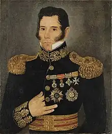 Although a staunch monarchist,[1] Gonçalves led the rebel forces in the Ragamuffin War. Radicals within the rebel ranks forced the rebellion to become republican, something that Gonçalves opposed.[2] Still, even though he fought against the Empire of Brazil, Gonçalves and his troops celebrated the birthday of the young emperor Pedro II of Brazil.[3] After the conflict ended with the victory of the Empire, Gonçalves paid his respect to Pedro II by kissing his hand during the latter's trip to Rio Grande do Sul in December 1845.[3]
