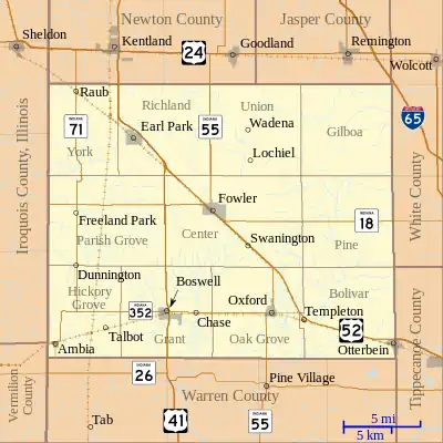 Benton County is located in the northwest part of the U.S. state of Indiana, along the border with Illinois. As of 2020, the county's population was 8,719.[1] It contains six incorporated towns as well as several small unincorporated settlements; it is divided into 11 townships which provide local services.[2][3] The county seat is Fowler.[4]
