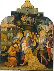This theme is one that has been depicted in Italian paintings since the Middle Ages, but it became particularly popular with Sienese painters after Bartolo di Fredi created his triptych to decorate the altar of the Three Kings in the Siena Cathedral. After this creation, Bartolo's influence began to be seen in nearly every Sienese painting of the same theme, including Benvenuto's. However, the influence of other artists is evident as well. It is believed that Benvenuto's version was inspired by Gentile da Fabriano's 1423 version that was commissioned by the Church of Santa Trinità.[3]
