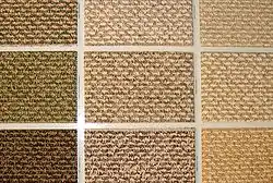 Modern industrialized Berber carpets are distinguished by a loop pile construction type that gives a similar appearance to the distinct knot of traditionally woven Berber carpets. The modern carpets usually contain small flecks of dark colour on lighter shades of background colours resembling a natural undyed version of the traditional carpets. They generally consist of a plain colour mix with no pattern, and are relatively cheap and durable. Popular for areas with significantly heavy use such as offices. The distinctive knot texture and appearance of traditional hand-woven Berber carpets today are generally woven in brightly coloured designs that are different from other oriental rugs.[4]