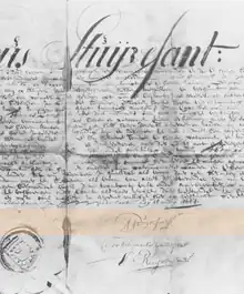 During negotiations for The Treaty of Breda, English commissioners' offers to return New Netherland in exchange for sugar factories on the coast of Suriname were refused. Upon its signing on July 31, 1667, English possession and rule were formalized. In 1668, they granted a charter for the "Towne and Corporation of Bergen".[51] The English also recorded many land purchases and transfers to both Dutch and English-speaking settlers, including those at Minkaque and Ramapo (Bayonne).[52] During this period they also confirmed previous patents and deeds,[53] in 1665 for a land owned by Nicolas Verlet at Hobuk (Hoboken), and in 1669 for a large tract (of 2260 acres) at Achinigeu-hach (or "Ackingsah-sack") (Hackensack River/Overpeck Creek) given earlier to Sarah Kiersted in gratitude for her work as emissary and interpreter by Oratam.[54][55]