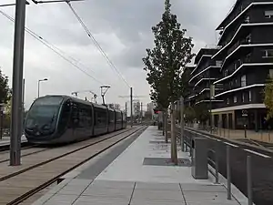 Berges du Lac tram stop is a tram stop on line C of the Tramway de Bordeaux. It is located on Cours de Québec in the north of the city of Bordeaux. The stop opened on 1 February 2014, when Line C was extended north from Les Aubiers, and was the northern terminus of Line C until a further extension to Parc des Expositions opened on 24 January 2015. The stop is operated by Transports Bordeaux Métropole.[1][2]