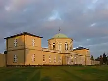 Between 1817 and 1820, a caretaker's house was built within the garden. Construction of a Palmenhaus (palm house) was begun in 1846, a conservatory for palms designed by court architect Georg Ludwig Friedrich Laves. Within five years of its completion in 1849, the building housed the most valuable and extensive collection of palms in Europe. A mausoleum, also designed by Laves, was built from 1842 to 1847. King Ernest Augustus, who died one year after completion, was interred there with his wife Queen Frederica.[3] In 1845 and 1846, walls and fences were added to provide seclusion. The palm house was replaced by a larger building in 1880. At 30 metres (98 ft) high, it was the biggest greenhouse at the time.[4]