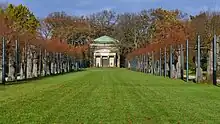 The garden was severely damaged by air raids in World War II.[1] The Palmenhaus had to be demolished in 1950. In 1952, the Garden Library was built which later became the seat of the garden's management. In 1957, further members of the Royal Family of Hanover, including King George I of Great Britain and his parents, were interred in the garden's mausoleum. The remains of John Frederick, Duke of Brunswick-Luneburg, his daughter Anna Sophie (1670–1672), Ernest Augustus, Elector of Brunswick-Luneburg and his wife Sophia of the Palatinate, their younger son Ernest Augustus, Duke of York and Albany and Princess Charlotte of Clarence (1819–1819), daughter of William IV of the United Kingdom, were interred, while the graves of Ernest Augustus, Duke of Brunswick and his wife Princess Viktoria Luise of Prussia are in front of the mausoleum.[3]