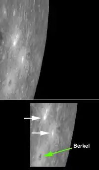 The two white arrows indicate neighboring bright craters, in contrast to Berkel's dark halo.