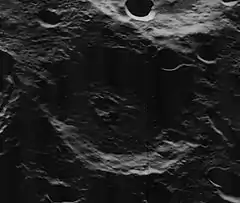 The outer rim of this crater has been worn and eroded, particularly along the northwest half. The most intact part of the rim is to the southeast, while the remainder has been impacted and notched by smaller impacts, and to the southwest overlain by material.