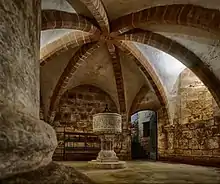 Berkswell's toponym is derived from the Berks Well, a 16 ft (5 m) square, stone-walled water well just outside the churchyard.[5] It is said to have been used for baptisms by immersion and can still be seen today.