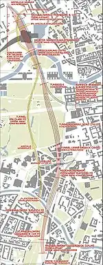 Potsdamer Bahnhof had a unique location in post-war Berlin. Located in the so-called lower Friedrichsvorstadt the Potsdamer Bahnhof became part of the new Kreuzberg borough in 1920. Since a change of borough boundaries in 1938, the boroughs of Tiergarten and Kreuzberg lay on either side of Potsdamer Bahnhof, but the boundary of the borough of Mitte skirted around the site of Potsdamer Bahnhof,[1] so it formed a long thin rectangle within Mitte extending as a salient south from the rest of Mitte towards, and just over, the Landwehr Canal.[2] The result was that Potsdamer Bahnhof was in the Soviet Sector of Berlin, which became the de facto capital of East Germany, while the approach track and neighbourhood to the East were in the American Sector of Berlin, and the neighbourhood to the West in the British Sector.