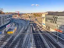 Between 1999 and 2003, the station was renovated and partially redesigned.[5] Presently, the site contains Rail City, a shopping center open for longer opening hours than most other shops in the city, and also on Sundays and public holidays, when most other shops are closed; this is possible as the shop opening laws of the Canton and the city of Bern do not apply to federally-owned real estate.[6] The station has six standard-gauge platforms serving twelve tracks (numbered 1–10 and 12–13) and two meter gauge RBS platforms serving four tracks (numbered 21–24). Curiously, there is no platform 11, but there is a through railway track with no platform face between platforms 10 and 12.[7] The station interchanges with many local bus, tram and trolley bus routes (operated by BERNMOBIL) and regional bus services (operated by PostAuto).