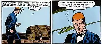 The spirit of Jim Corrigan sees his own corpse: More Fun Comics #52 (Feb. 1940). Script by Jerry Siegel, art by Baily.