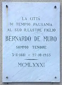 By 1935 De Muro was forced to cancel performances due to ill health.[5] He became a successful businessman with a large cork factory in Milan.[1] In his later years he taught voice in New York City, Sturgis, Michigan, and Rome. He died in Rome in 1955.[6] Recognized as Tempio's most famous son, his body was brought back to the place of his birth, and he was buried under a pyramid of his own design.[7]