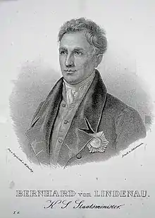 Lindenau was born in Altenburg, the son of Johann August Lindenau, a regional administrator (Landschaftsdirektor). In 1793, Lindeau began studying law and mathematics at Leipzig, and beginning in 1801 he worked at the astronomical observatory in Seeburg.[1] In 1830 he was the Minister of the Interior during a turbulent period in the history of Saxony. Late in the year he oversaw measures to calm violent protests demanding political reform. From 1831 to 1843 he was Minister-President.