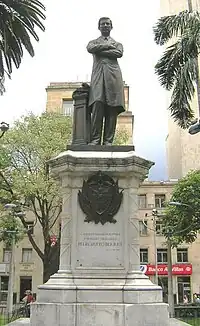 In the center stands the statue of Pedro Justo Berrío, which rests on a pedestal of Carrara marble.[5] The statue was officially requested by the Governor of Antioquia under Ordinance 26 on 24 August 1980.[6] It was created in Rome by Italian artist Giovanni Anderlini, who referenced three photographs of Berrío when making the sculpture.[7] The statue was promised to be the same size as a similar statue of Simón Bolívar, which Tenerani created for Bogota.