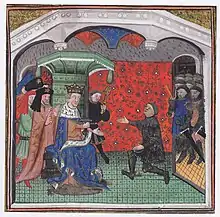 Miniature of du Guesclin being made Constable of France by Charles V, in the 15th-century Chronique de Bertrand du Guesclin