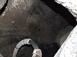 Berwartstein has an opening on the southeast side of the cliff, commonly referred to as Aufstiegskamin ("entrance chimney"). During the early years of the castle only the rooms and casemates in the upper cliff were complete and the shaft was the only entrance to the castle. To make it easier to ascend the shaft, a portable wooden staircase or rope ladder was placed into the castle. In the event of attack, the staircase or ladder was hoisted up into the castle. This enabled the entrance to be defended by just one man who was supplied with boiling sap, oil or liquid to pour on any intruder attempting to ascend the shaft. This limited access to the castles inner rooms was probably the main reason it was never conquered during the Middle Ages. The narrow, almost vertical cliff on which the castle stands, rises to a height of approximately 45 metres.