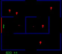 The player advances by escaping from the maze through an opening in the far wall. Each robot destroyed is worth 50 points. If all the robots in the current maze have been destroyed before the player escapes, the player gains ten points per robot. The game has 65,536 rooms (256×256 grid), but due to limitations of the random number generation there are fewer than 1,024 maze layouts (876 of which are unique). It has only one controller, but two-player games can be accomplished by alternating at the joystick.[4]