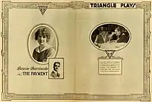 Barriscale began her film career in 1913, debuting on-screen in Lasky Picture Company's Rose of the Rancho.[4] She worked intensively for New York Motion Picture Company and Triangle Film Corporation (among other studios) until she announced her retirement in the early 1930s. In 1917, she had her own production company, the Bessie Barriscale Feature Company.[6] Barriscale announced the formation at a news conference on May 1, 1917.[7] Plans called for the company to produce six to eight features each year. Another new company, Paralta Plays, was designated to distribute the films.[8] James Young was hired as one of three directors for Barriscale's new company.[9]