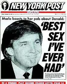 "Best Sex I've Ever Had" is a headline that appeared on the front page of the New York Post on February 16, 1990. The headline is purportedly a quote from Marla Maples, who would become the second wife of businessman Donald Trump. The quote refers to Trump's supposed sexual prowess. Trump was married to Ivana Trump at the time of the headline; the couple's divorce was granted that year.[1] The headline appeared during a media frenzy concerning the Trumps' marriage and his affair with Maples.