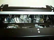 Unlike in Betamax VCRs, the tape is wrapped 300° around a miniaturised head drum[3] nearly 45 mm in diameter with a single dual-azimuth head to write the video tracks, using a special tape transport reminiscent of that of VHS (in that the tape is wrapped around the head drum in a similar manner, but with a more extreme wrap). Compared to the normal Betamax head drum of 75 mm, the Betamovie head drum spins at 2500 rpm rather than 1500 rpm. The fields on the tape are written at 120% (i.e. six-fifths) the normal speed.